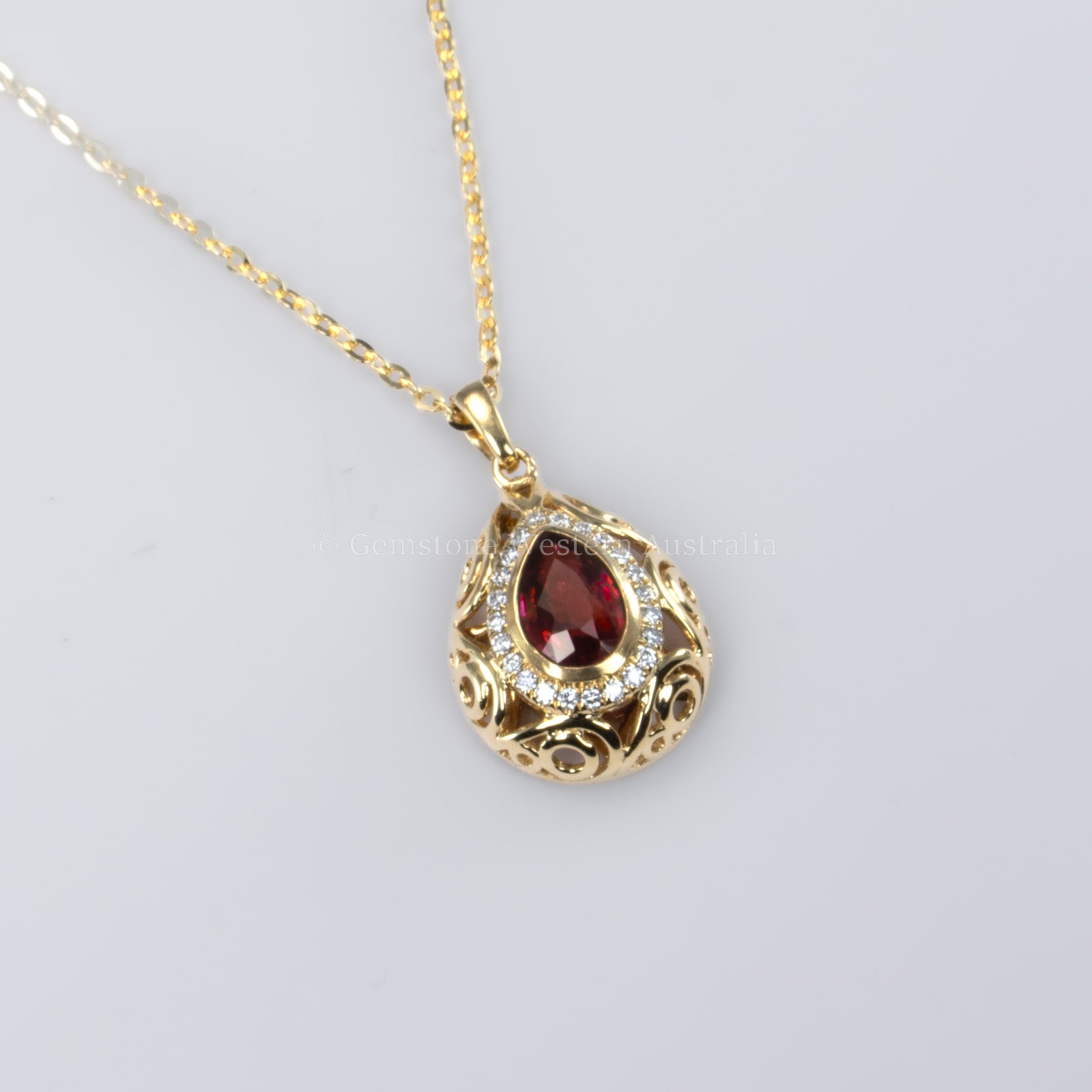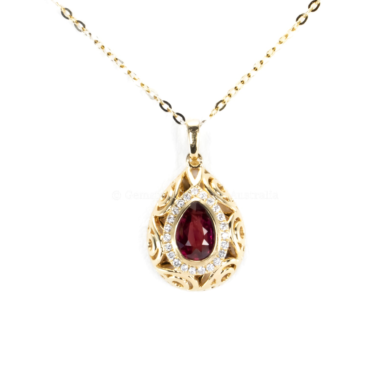Pear Shape Unheated Ruby Pendant A stunning Pear Shape Unheated Ruby Pendant, designed to captivate with its rich, natural beauty. The centrepiece is a vibrant, unheated pear-cut ruby, radiating deep red hues that symbolise passion and elegance. Surrounding the ruby is a brilliant halo of brilliant-cut diamonds, enhancing its fiery glow. Delicate, rounded openwork details frame the pendant, creating a sophisticated dome-style design that adds timeless charm. Perfect for those who appreciate rare, natural gemstones in a breathtaking statement piece. Explore our collection of 2000+ gems in stock, including Loose Rubies. Can't find what you want? Contact us here for a wider selection. For custom designs, expert advice, and more information, book here a complimentary appointment with our expert gemologist and designers.