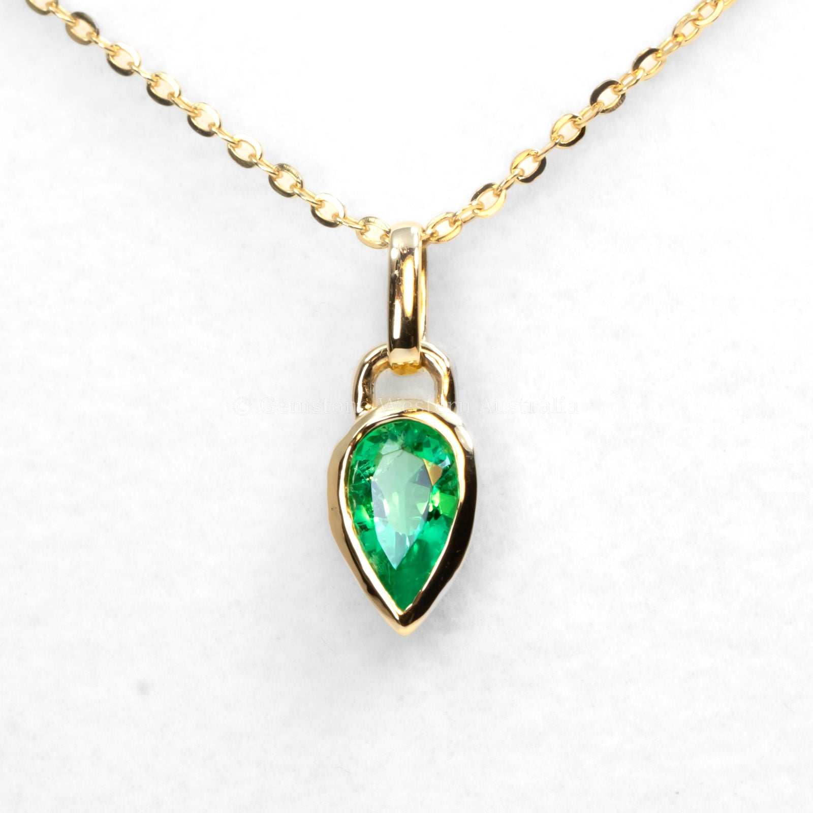 Colombian Emerald Gold Pendant This exquisite pendant features a stunning natural, pear-shaped Colombian emerald, known for its rich, vibrant green hue and exceptional clarity. The emerald is set in a sleek bezel, allowing its captivating colour to take centre stage. Suspended elegantly from a delicate gold bar in the shape of a lock, which connects to the top of the pear shape, this design offers a unique and modern twist on classic elegance. The combination of the emerald’s natural beauty and the refined gold detailing creates a sophisticated yet timeless piece, perfect for any occasion. Crafted in high-quality gold, this pendant showcases the legendary Colombian emerald, bringing both luxury and heritage to your jewellery collection. Explore our collection of 2000+ gems in stock, including Loose Emeralds. Can't find what you want? Contact us here for a wider selection. For custom designs, expert advice, and more information, book here a complimentary appointment with our expert gemologist and designers.