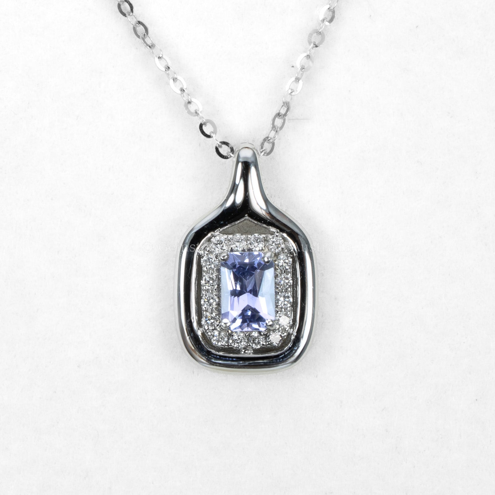 A refined and graceful purple sapphire diamond pendant, this piece features a captivating radiant cut natural sapphire in a soft, delicate purple hue. Its elegant geometry is complemented by a sparkling halo of round brilliant cut diamonds that highlight the sapphire’s brilliance with a subtle yet striking contrast.