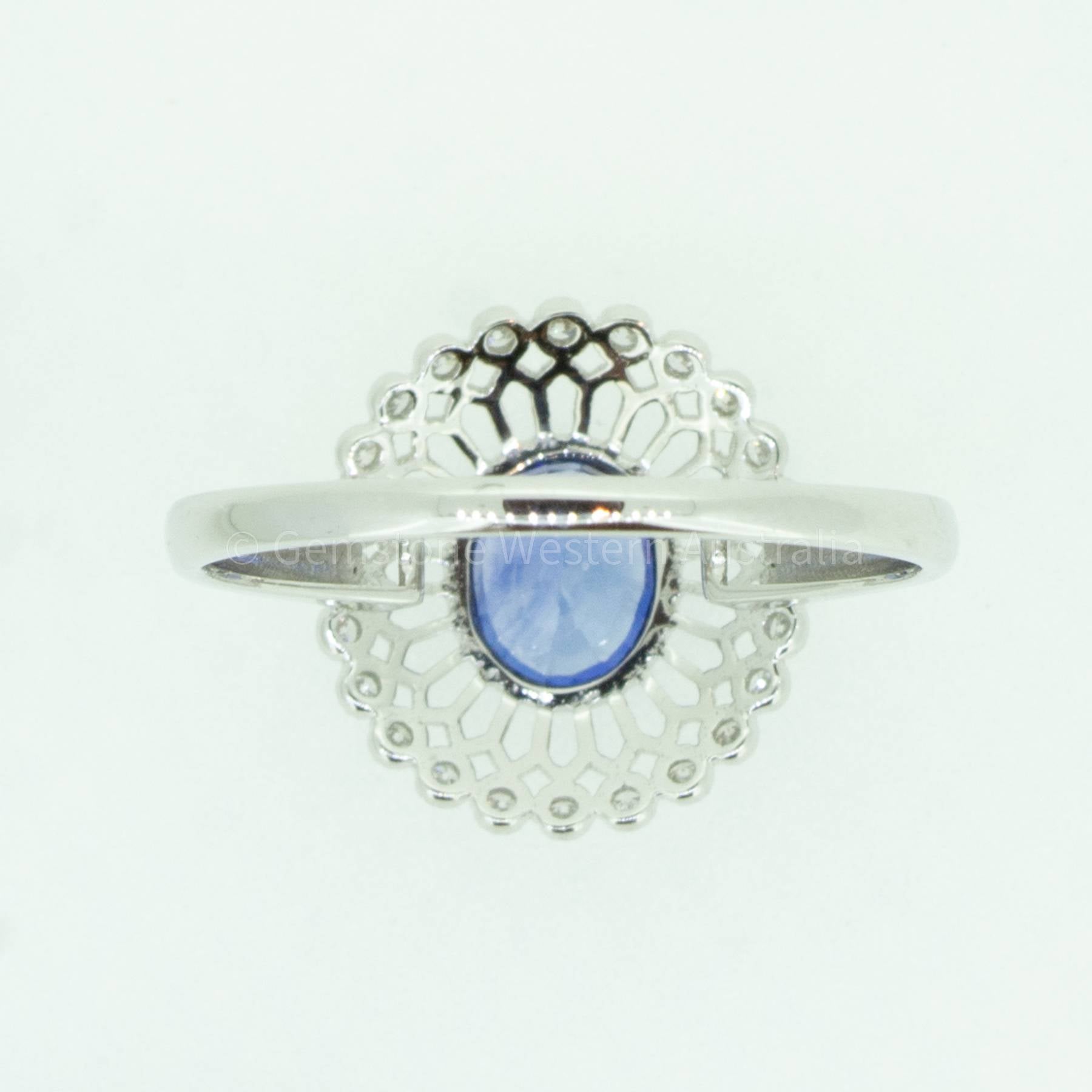• Central stone: One oval Faceted Sapphire, bezel set. 6.50x4.85x3.20mm approx. Colour: Strong blue, eye clean. Weight: 0.85ct approx.