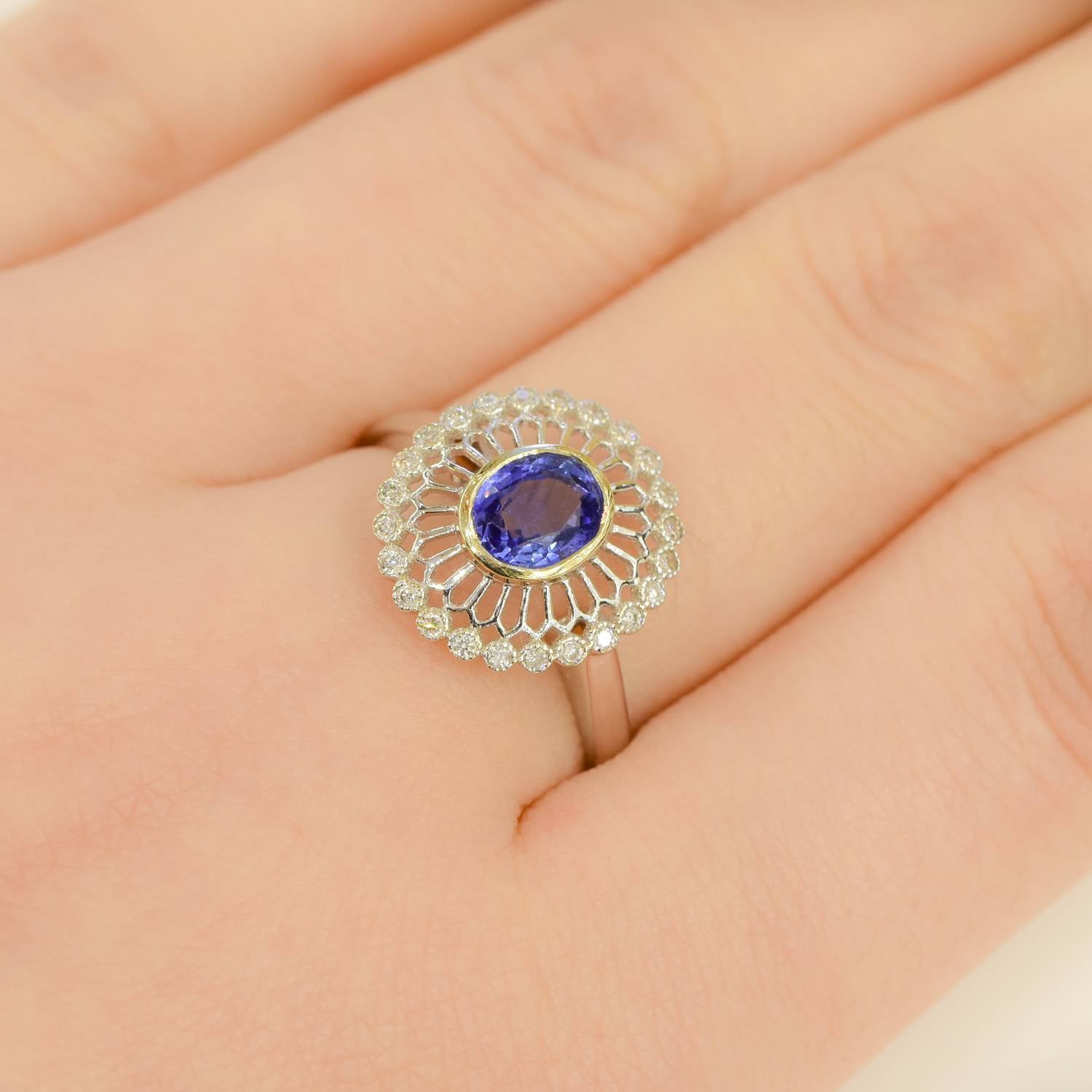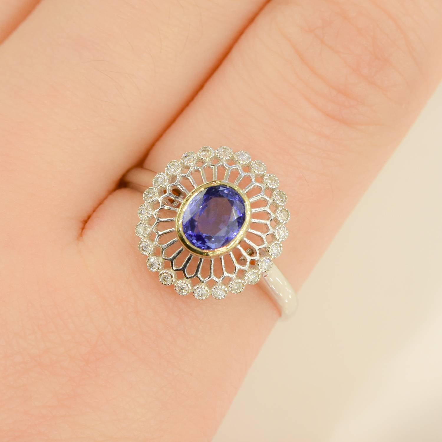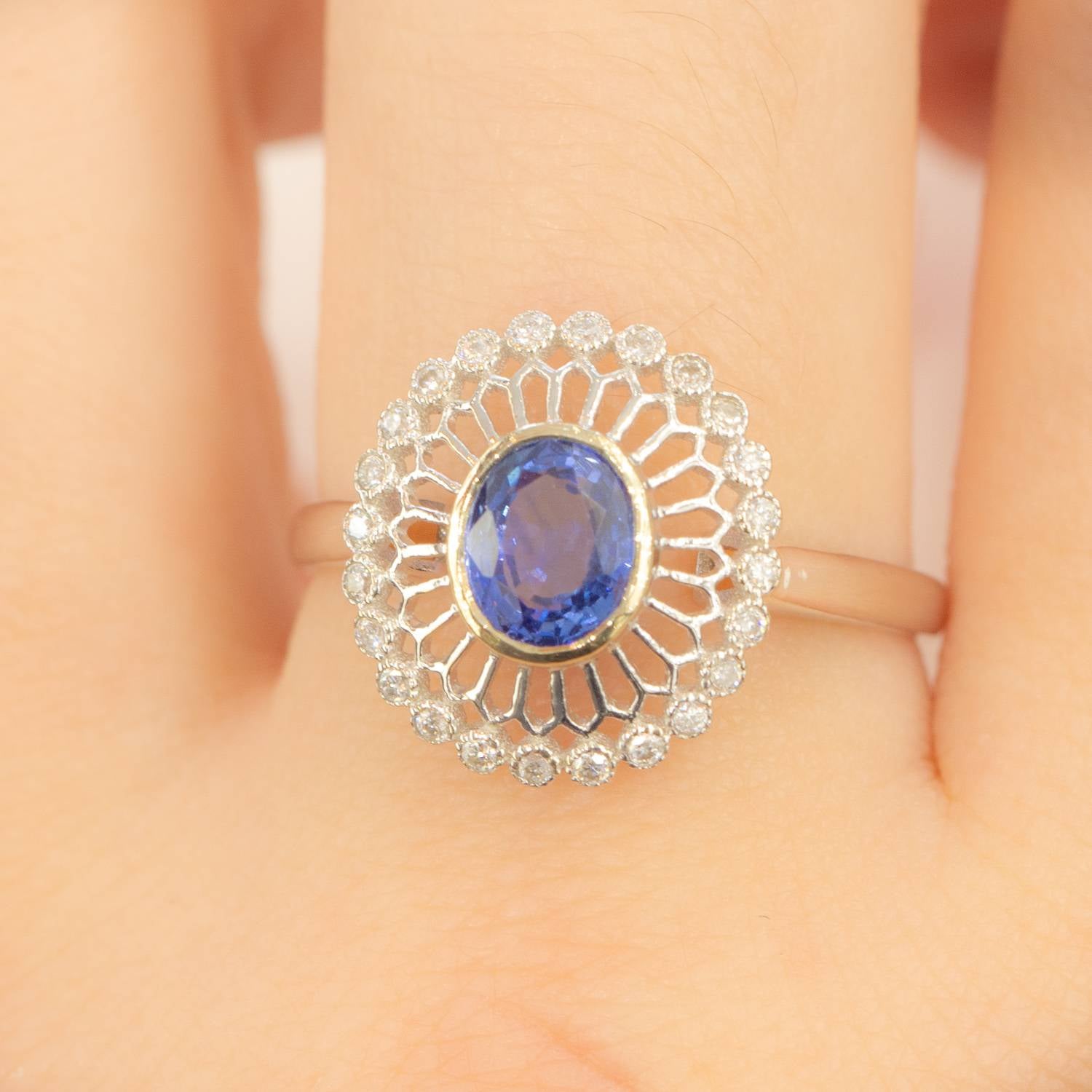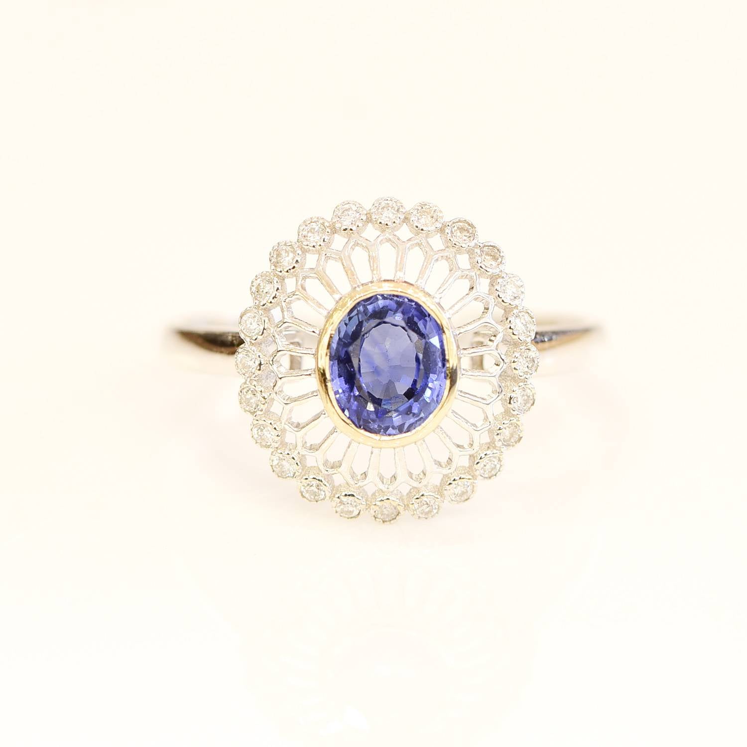 This stunning Sapphire and Diamond Halo Ring design is an art deco-inspired ring which features a bezel set oval faceted sapphire in the centre of an oval open work design bordered by 24 round brilliant cut diamonds. This ring will impress whenever you wear it, it’s a statement as well as a dainty piece of jewellery. Explore our collection of 2000+ gems in stock, including Loose Sapphires. Can't find what you want? Contact us here for a wider selection. For custom designs, expert advice, and more information, book here a complimentary appointment with our expert gemologist and designers.