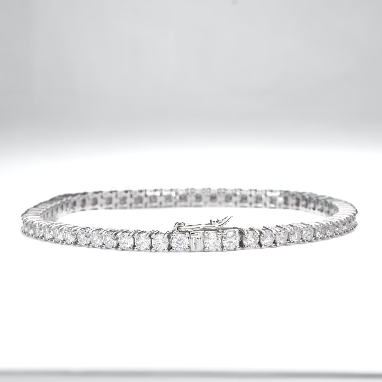 Silver Moissanite Tennis Bracelet Silver moissanite tennis bracelet crafted in 925 sterling silver and set with 59 round brilliant moissanites, each measuring 2.9mm in diameter. Designed for elegance and comfort, this piece offers a refined, modern alternative to traditional diamond tennis bracelets. The moissanites deliver outstanding brilliance and fire, while the silver setting ensures lasting quality and shine. Finished with a secure clasp, this bracelet adds understated luxury to everyday outfits and special occasions alike. SPECIFICATIONS: 1982870