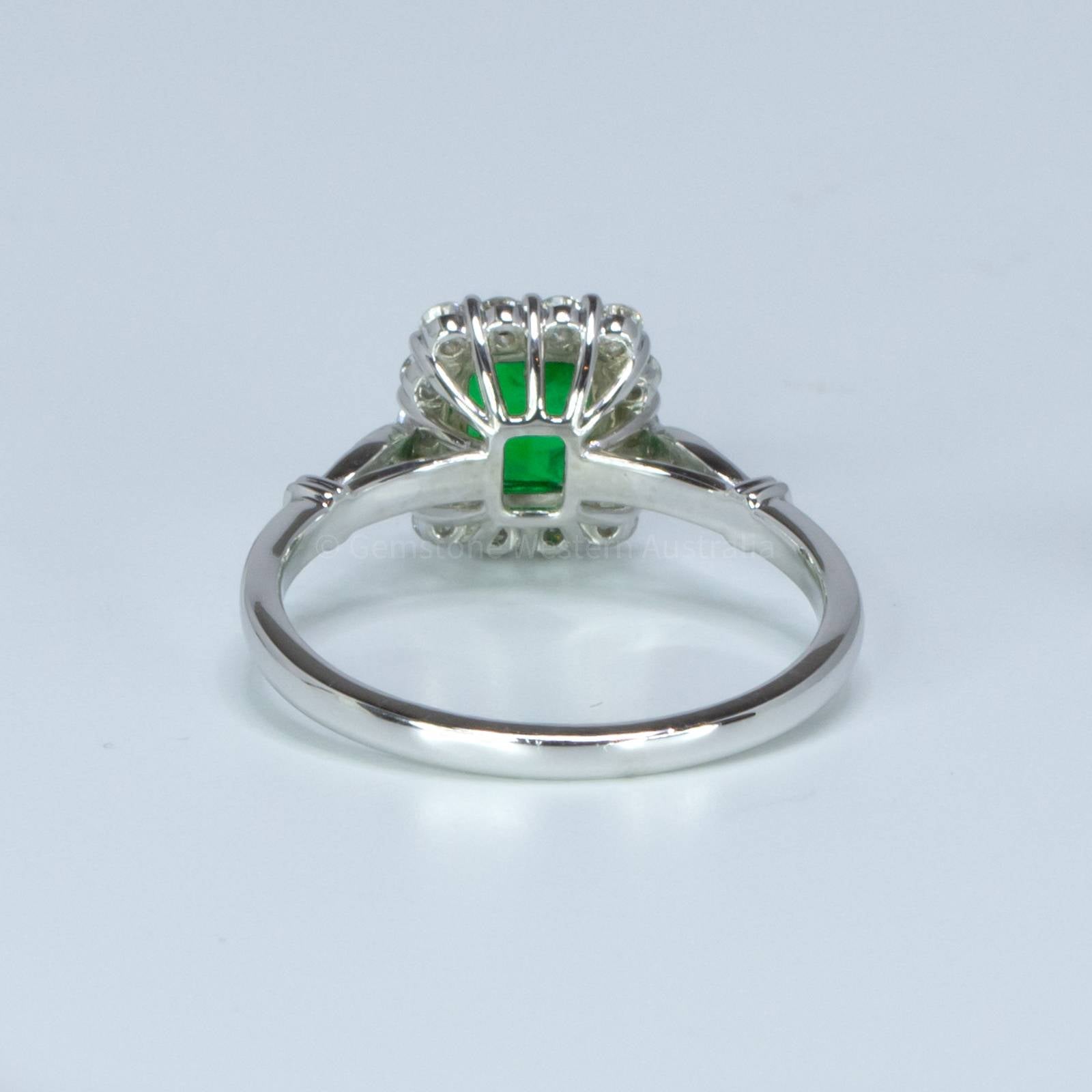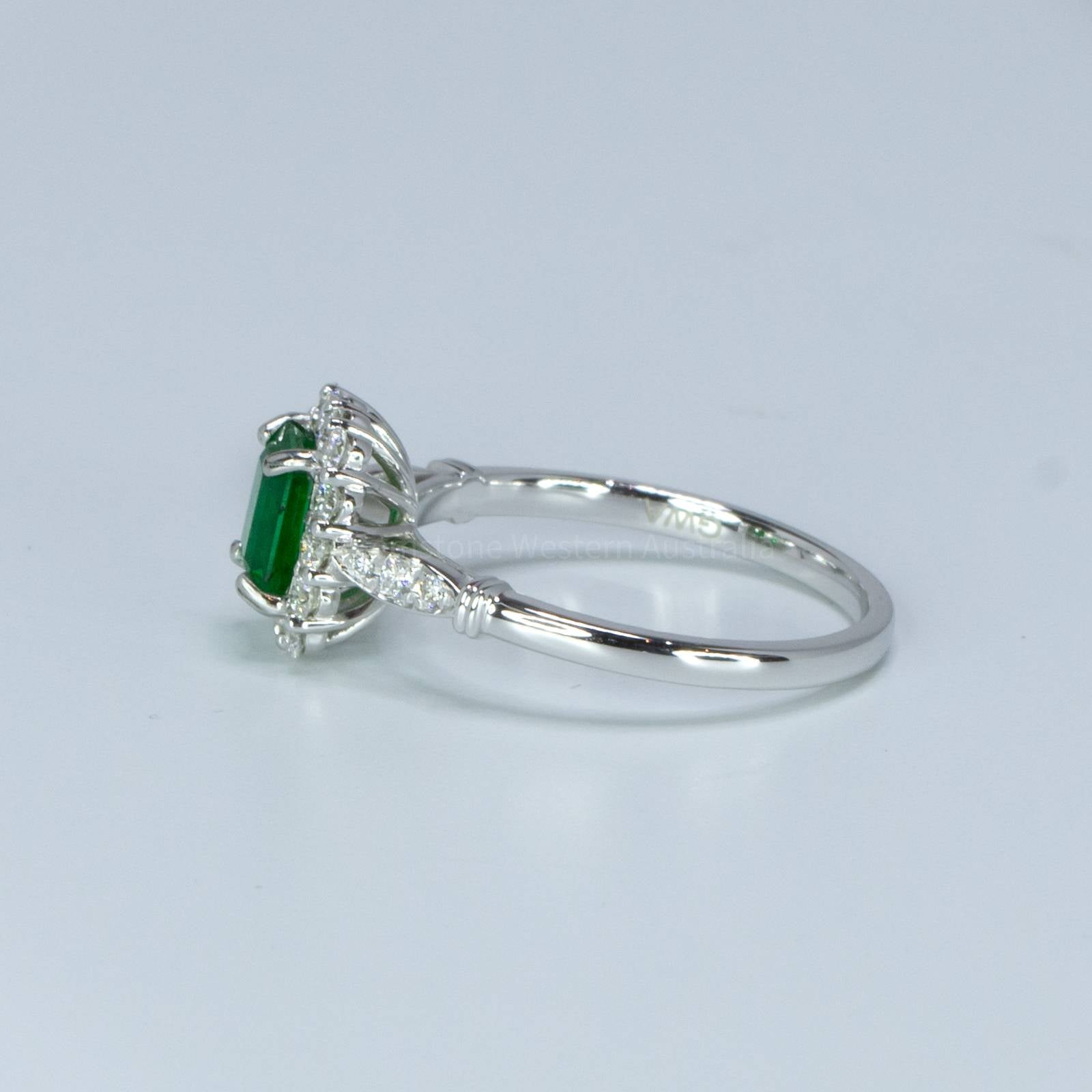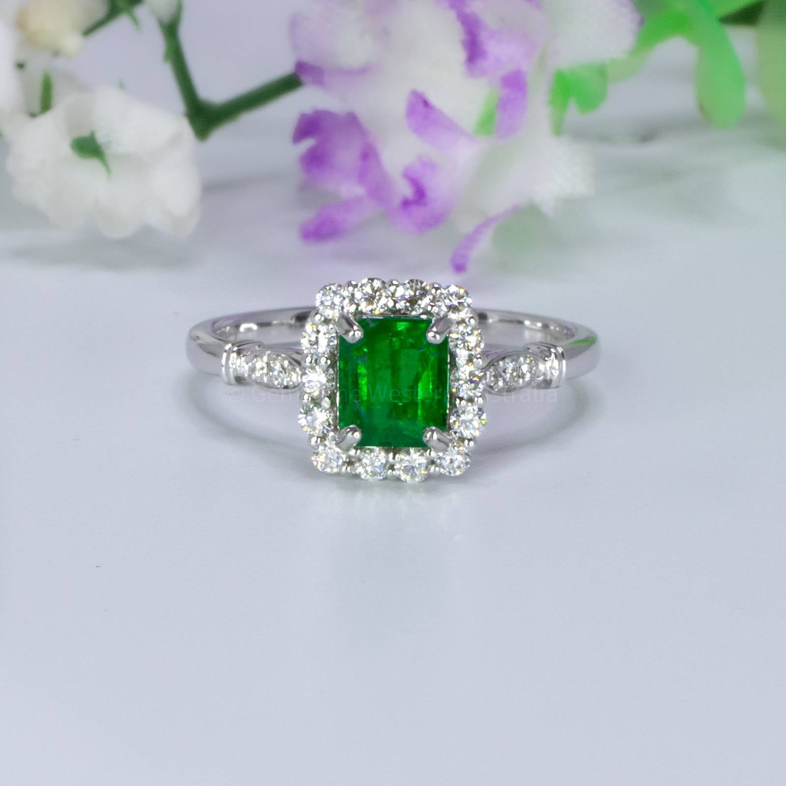 A classic Emerald Cut Emerald Ring featuring a natural Colombian Emerald, set in a halo of round brilliant cut diamonds E-F colour. The emerald delights with that characteristic intense vivid green found in Colombian emeralds and combined with superb clarity makes this piece a fine ring to last for generations. The ring is made of platinum. Explore our collection of 2000+ gems in stock, including Loose Emeralds. Can't find what you want? Contact us here for a wider selection. For custom designs, expert advice, and more information, book here a complimentary appointment with our expert gemologist and designers.