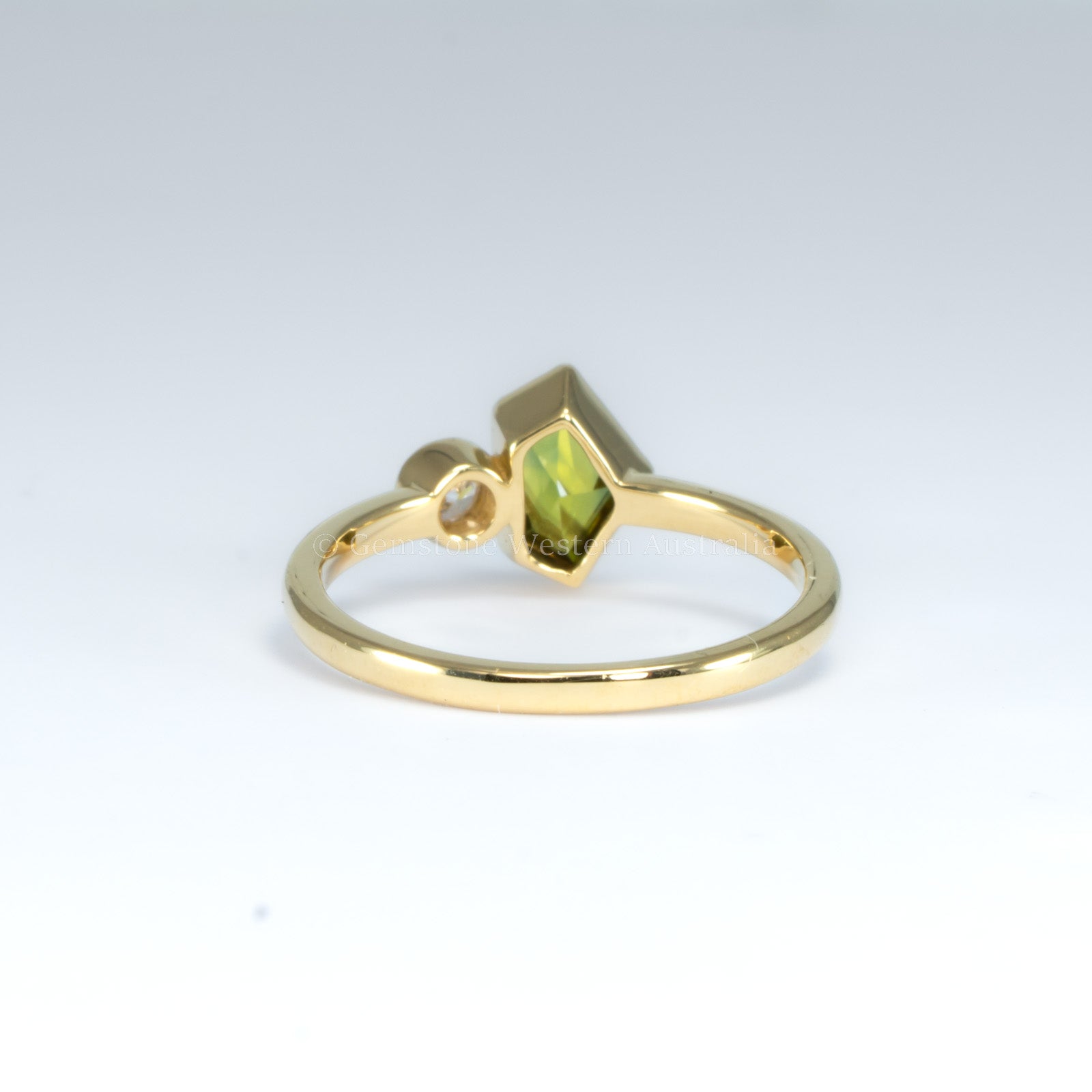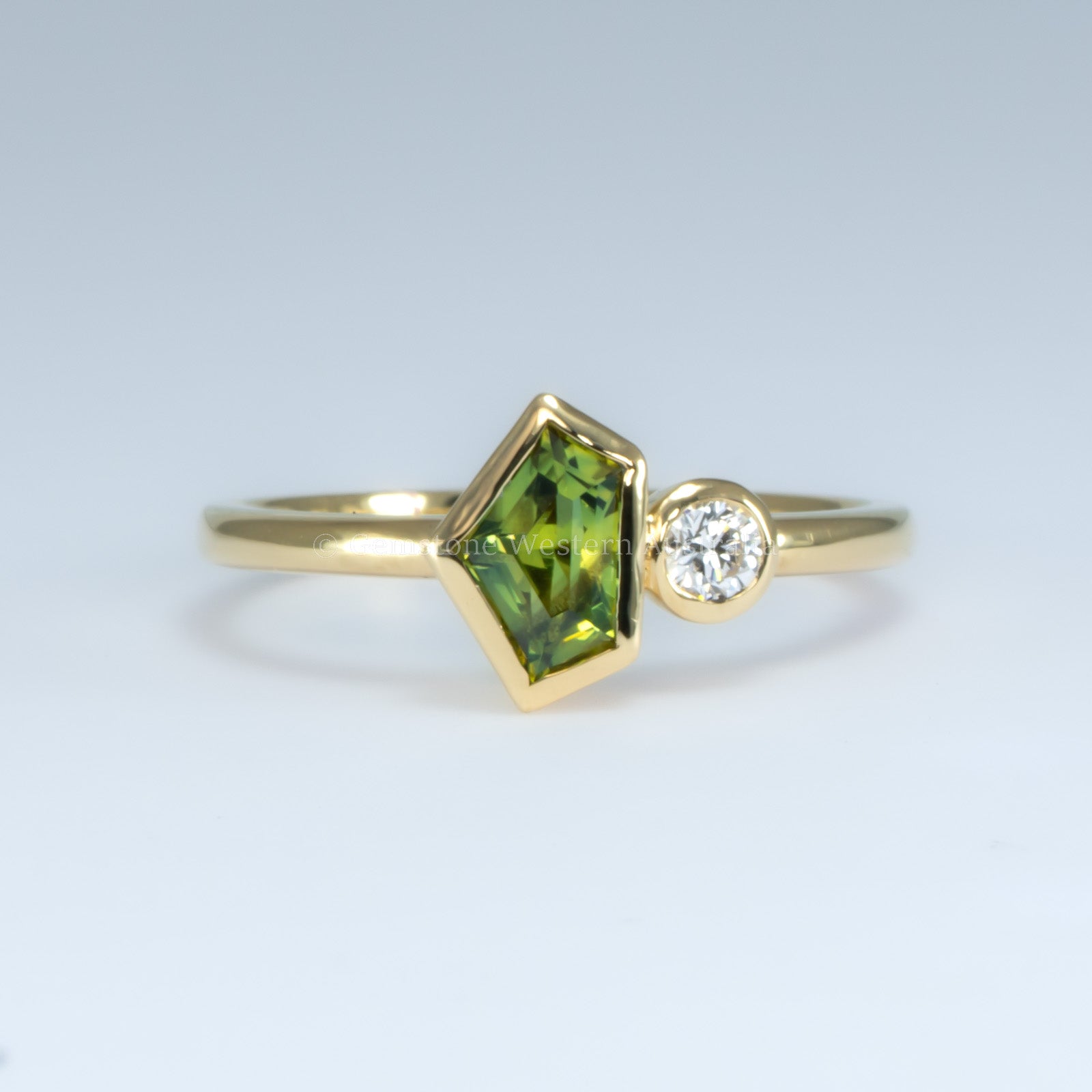 Toi et Moi Ring in 18K Yellow Gold Toi et Moi ring in 18K yellow gold featuring a 0.75ct natural freeform teal sapphire and a 0.1ct round brilliant-cut diamond. Both gemstones are bezel-set, highlighting their unique shapes while ensuring durability. The design is completed with a dainty yet sturdy straight band, offering timeless elegance and modern charm. Explore our collection of 2000+ gems in stock, including Loose Sapphires. Can't find what you want? Contact us here for a wider selection. For custom designs, expert advice, and more information, book here a complimentary appointment with our expert gemologist and designers.