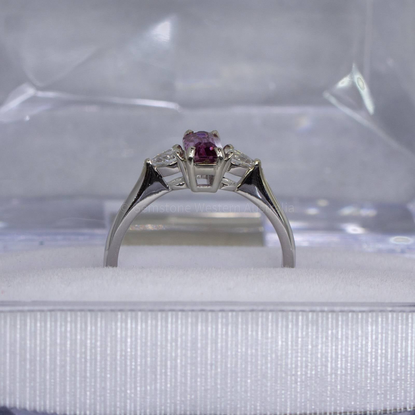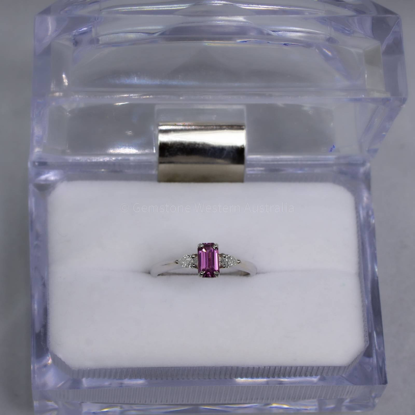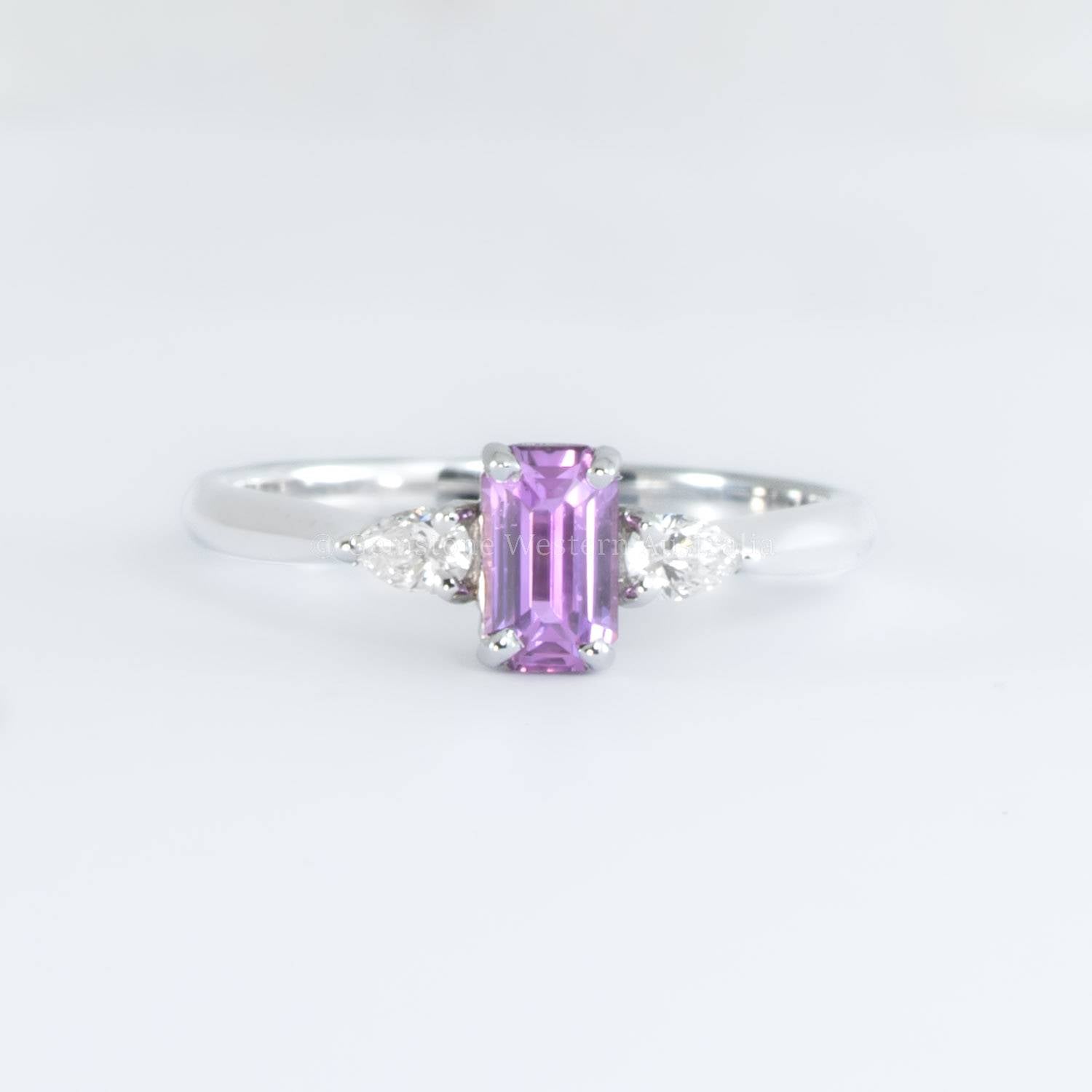 A stunning unheated purplish pink sapphire is set at the centre of this gorgeous Pink Sapphire and Diamond Ring. The purplish pink sapphire features a graceful radiant step cut that makes the gemstone look brilliant and elegant. It is adorned by two pear brilliant cut diamonds all set in a white gold classic three-stone style ring.  Explore our collection of 2000+ gems in stock, including Loose Sapphires. Can't find what you want? Contact us here for a wider selection. For custom designs, expert advice, and more information, book here a complimentary appointment with our expert gemologist and designers. SPECIFICATIONS: 1982462