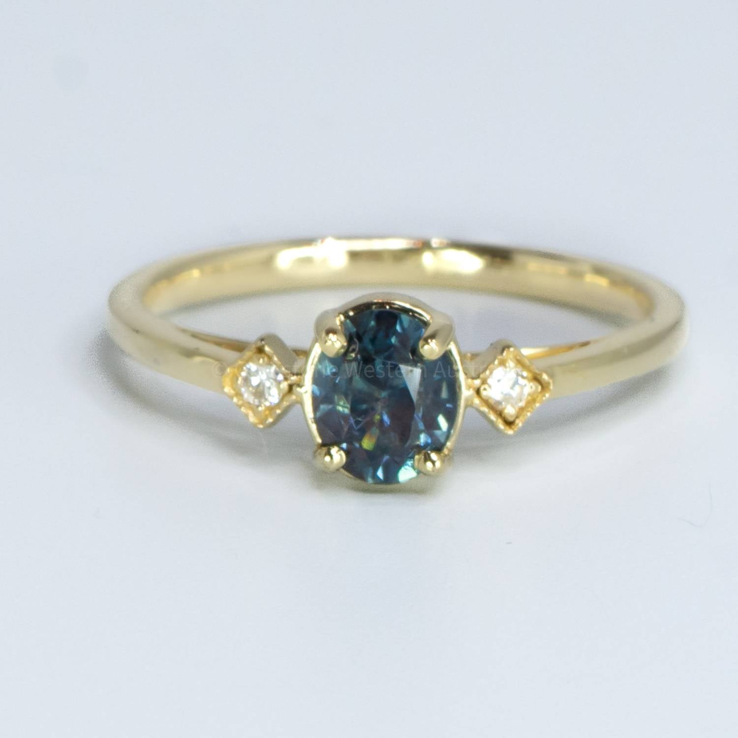 A stunning Unheated Teal Sapphire and Diamond Ring features an unheated teal green sapphire as the star of this spectacular ring. The teal sapphire is adorned by two round brilliant cut diamonds set in a yellow gold Art Deco style ring.  Explore our collection of 2000+ gems in stock, including Loose Sapphires. Can't find what you want? Contact us here for a wider selection. For custom designs, expert advice, and more information, book here a complimentary appointment with our expert gemologist and designers. SPECIFICATIONS: 1982527