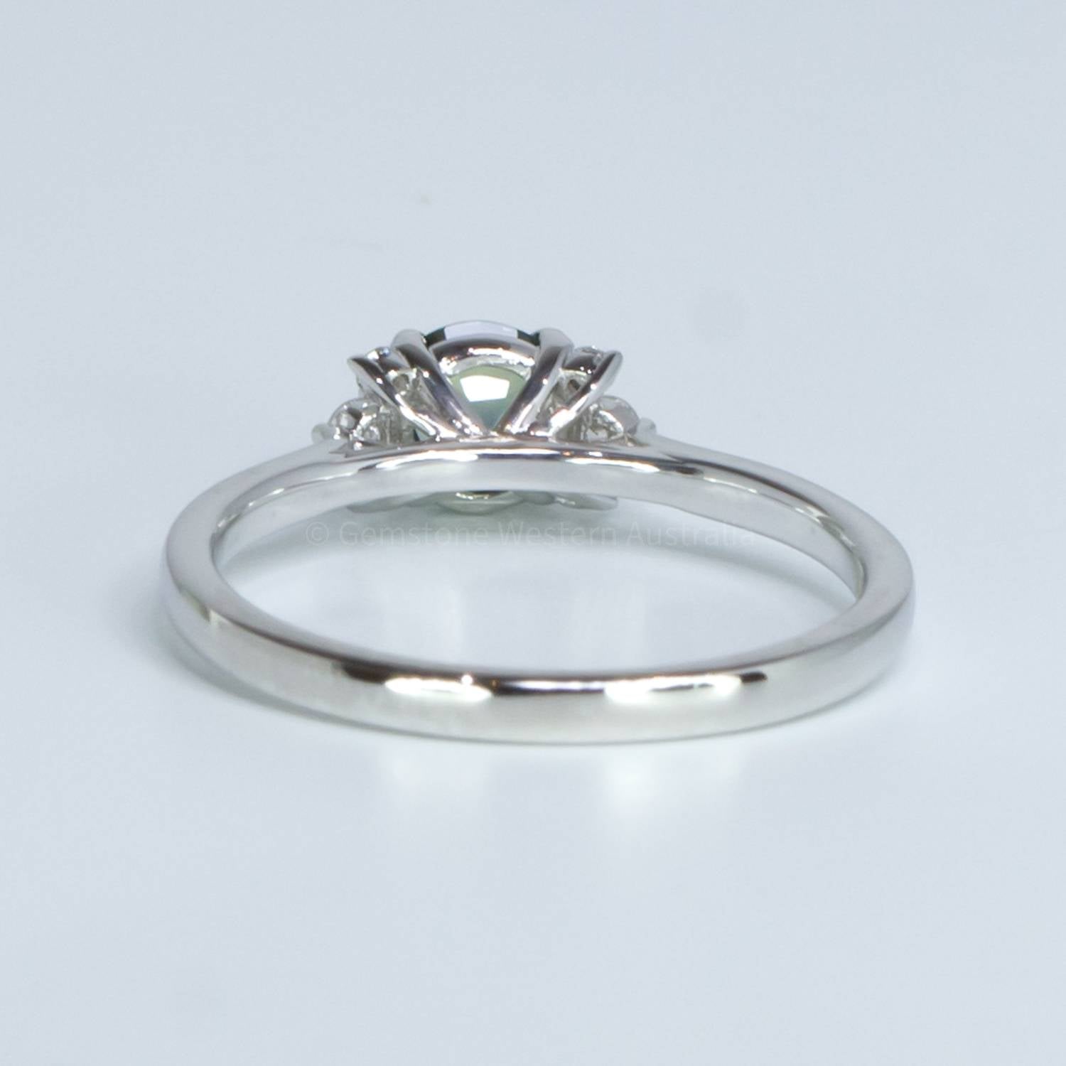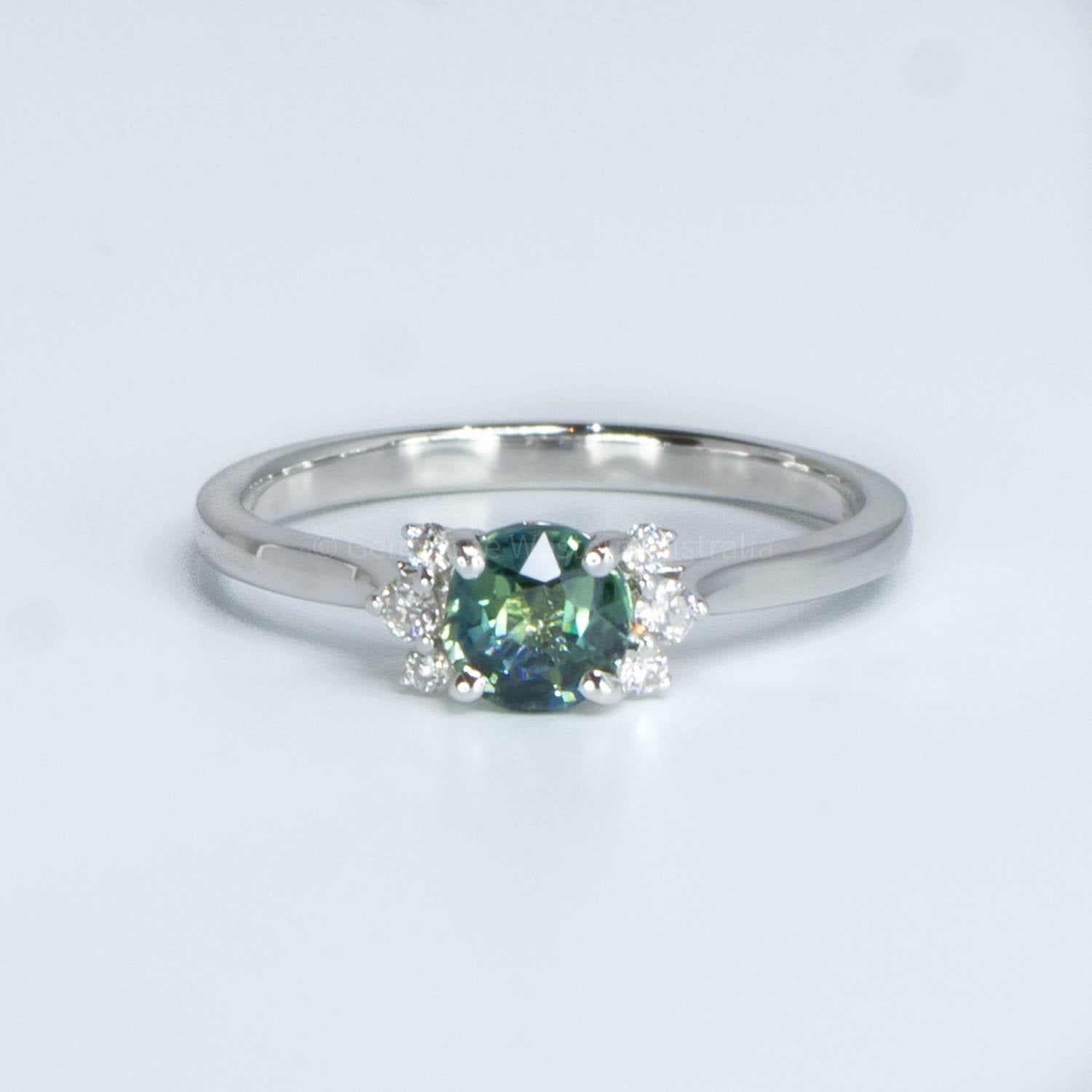 A gorgeous Unheated Teal Sapphire and Diamonds Ring features a round cut teal green sapphire adorned by three round brilliant cut diamonds to each side of the sapphire.  The gemstones bright beautifully in their white gold setting. This ring would make a stunning delicate engagement ring as well as a lovely petite dress ring.  Explore our collection of 2000+ gems in stock, including Loose Sapphires. Can't find what you want? Contact us here for a wider selection. For custom designs, expert advice, and more information, book here a complimentary appointment with our expert gemologist and designers. SPECIFICATIONS: 1982525