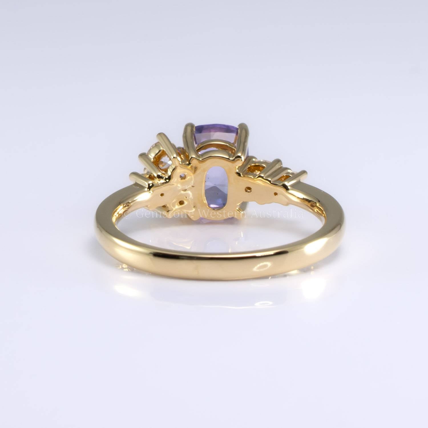 Discover elegance redefined with our exquisite natural unheated violet sapphire ring, gracefully nestled amidst a symphony of round brilliant-cut diamonds. Asymmetrical placement adds a captivating allure, with three diamonds adorning one side and two on the other, each of varying sizes. Elevate your style with this mesmerizing blend of sophistication and individuality set in 18K yellow gold.   Explore our collection of 2000+ gems in stock, including Loose Sapphires. Can't find what you want? Contact us here for a wider selection. For custom designs, expert advice, and more information, book here a complimentary appointment with our expert gemologist and designers.