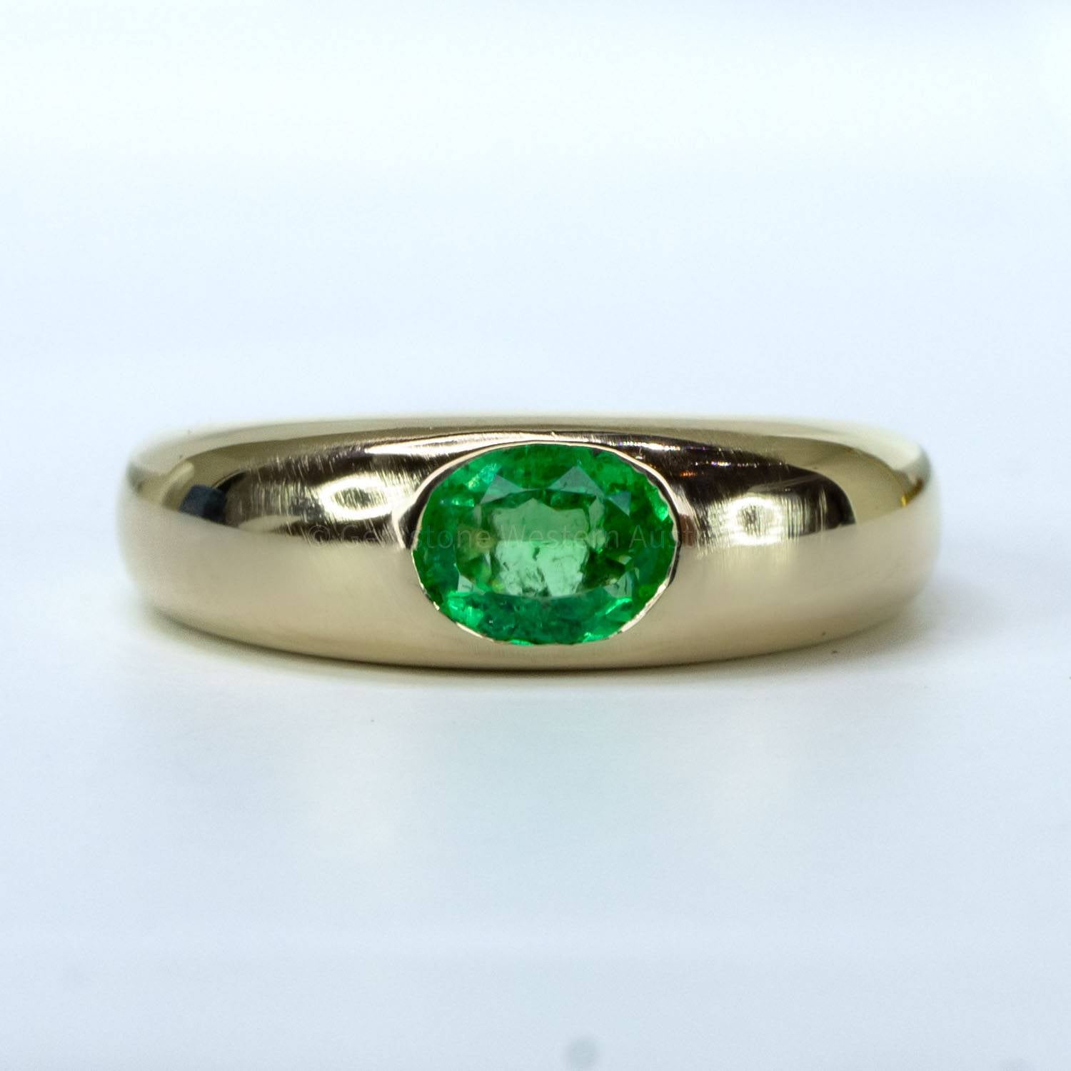 Make a bold statement with this stunning Dome Statement Ring featuring a bezel-set oval cut natural Colombian Emerald. The rich green hue of the emerald, weighing 0.61 carats, captures attention from every angle. Crafted with exquisite detail, the emerald is set east to west, adding a unique and contemporary touch to the design. Explore our collection of 2000+ gems in stock, including Loose Emeralds. Can't find what you want? Contact us here for a wider selection. For custom designs, expert advice, and more information, book here a complimentary appointment with our expert gemologist and designers.